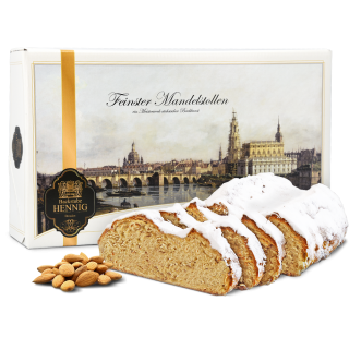 Ein Pfund handgemachter edler Mandelstollen, traditionell und liebevoll von Hand gebacken. Der Mandelstollen wird im Stollen-Geschenkkarton mit Motiv "Panorama Dresden" verpackt. Eine Einlage in Strohoptik schützt ihn zudem beim Versand. Im Gegensatz zum klassischen Stollen enthält der Mandelstollen einen größeren Anteil Mandeln und keine Rosinen / Sultaninen.